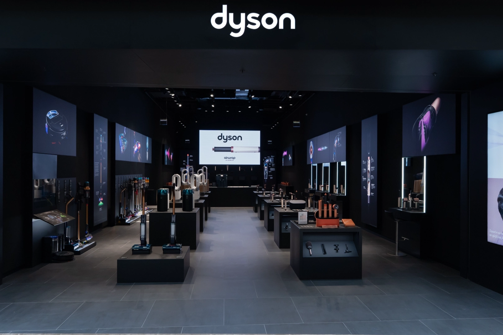 Mağaza içerisinde yer alan özel saç şekillendirme alanı, profesyonel bir salon deneyimini mağaza ortamına taşıyor. Birden fazla istasyonla donatılmış bu alanda ziyaretçiler, Dyson Saç Stilistleri eşliğinde ıslak ve kuru saç şekillendirme hizmetlerinden yararlanabiliyor.