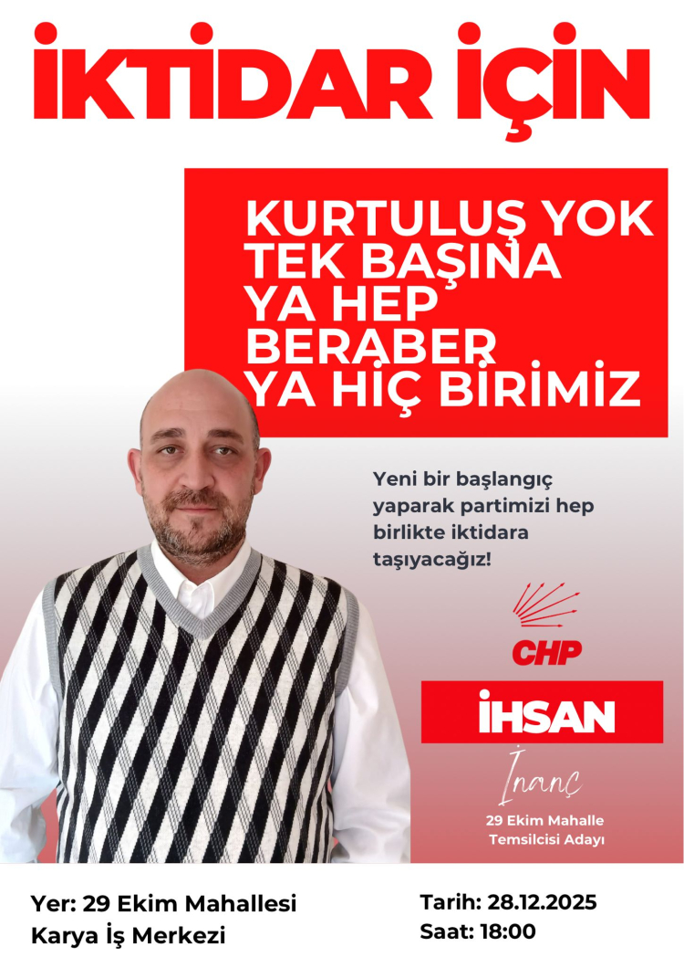 CHP'nin Mahalle Temsilciliği seçimleri sürüyor. 29 Ekim Mahallelesi için iki aday yarışıyor. 29 Ekim Mahallesi'nde seçimler 28 Aralık 2025'te yapılacak. İhsan İnanç, "Birlikte başaracağız" diyerek güçlü bir aday olarak öne çıkıyor.