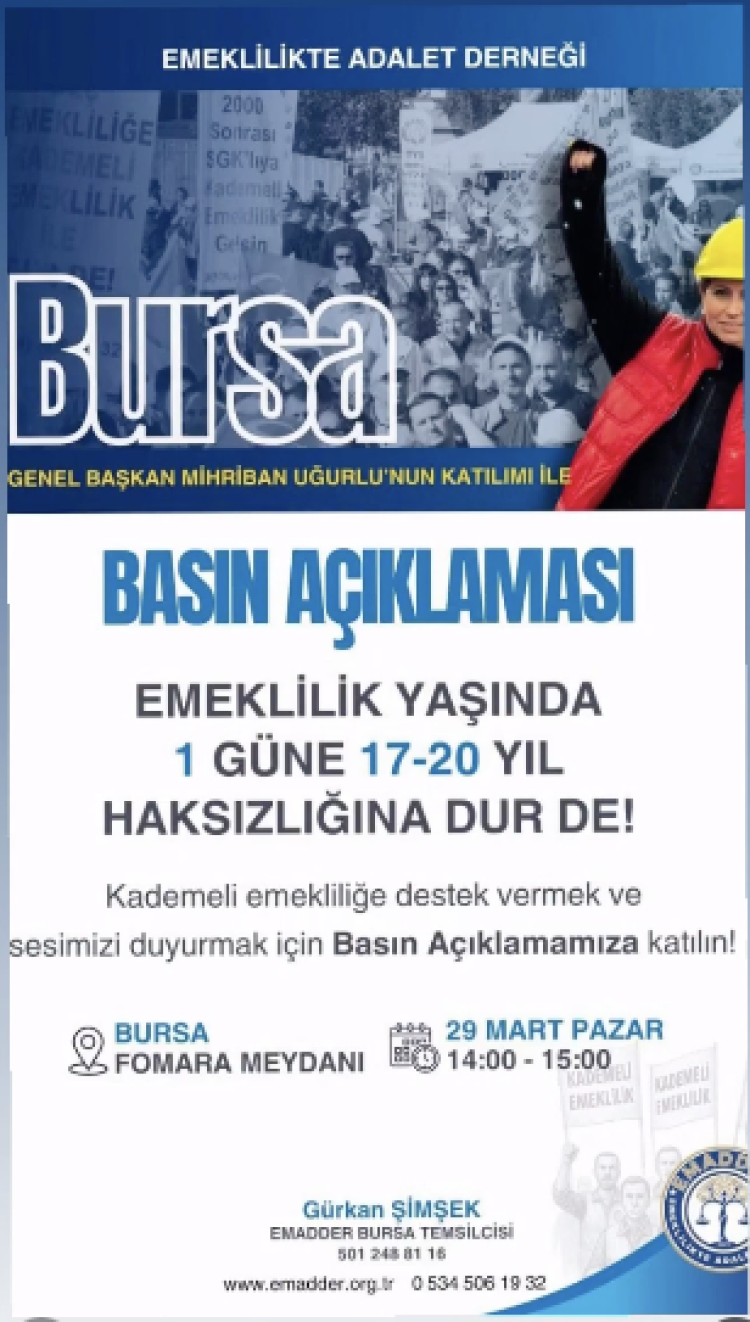 EMADDER Emeklilikte Adalet Derneği pazar günü Bursa 'daydı. Bursa Fomara meydanında yapılan basın açıklamasında EMADDER başkanı Mifriban Uğurlu çalışanlar için hak ve adalet vurgusu yapdı. 8 Eylül 1999 yapılan EYT (Emeklilikte Yaşa Takılanlar) düzenlemesi oluşturduğu mağduriyete değinen Uğurlu 1 günün oluşturduğu 17-20 yıllık mağduriyete değinerek Emeklilikte Kademe çağrısı yaptı.